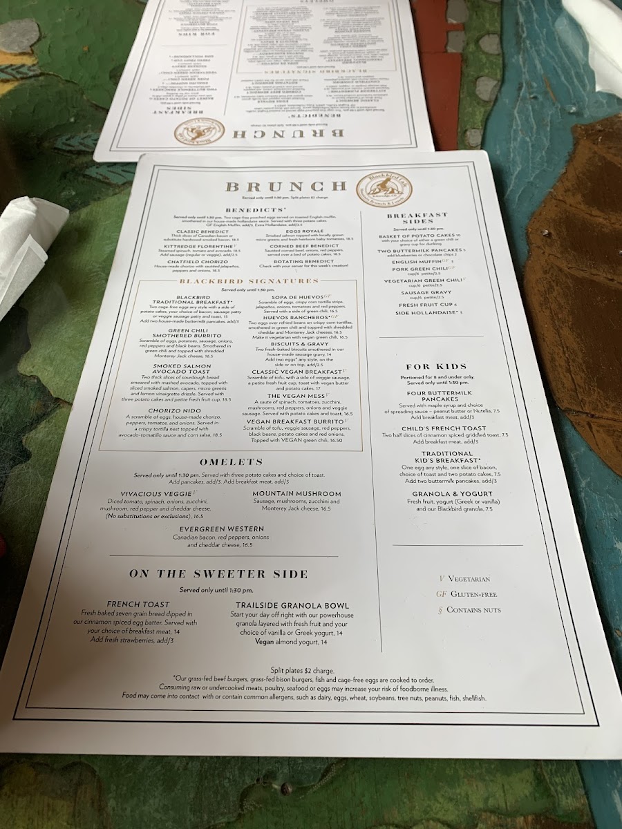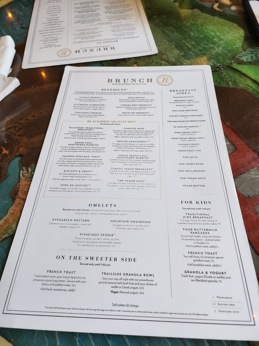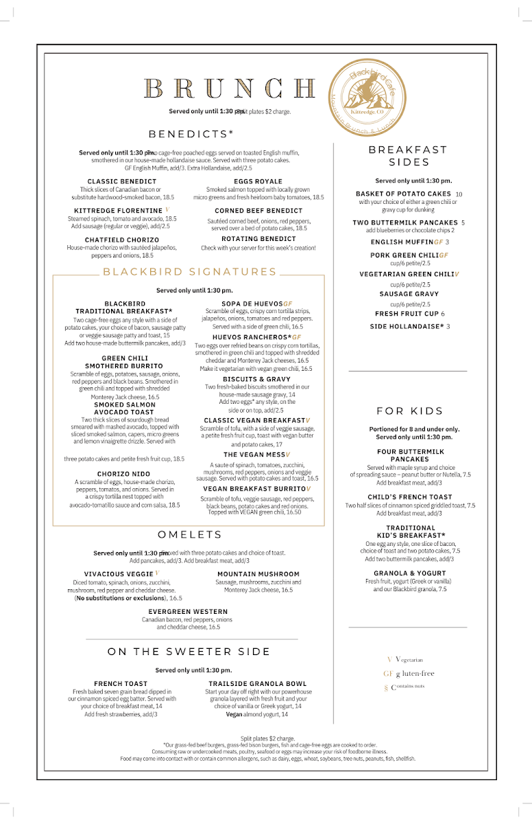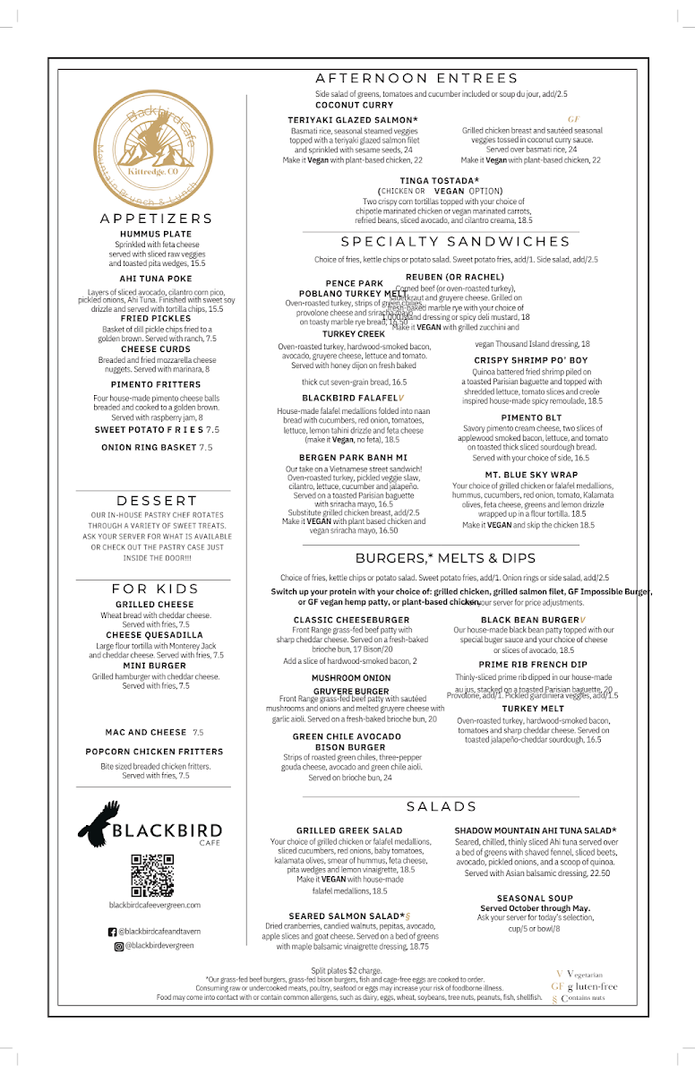 At the Blackbird Cafe - Mountain Brunch & Lunch, nestled in the scenic Evergreen region, the menu is a celebration of fresh, flavorful ingredients. This cozy eatery offers a delightful array of brunch and lunch items, catering to diverse palates. Start your day with standout dishes such as the corned beef egg Benedict, artfully served with crispy hashbrowns that elevate the classic. For lunch, the Teriyaki Glazed Salmon paired with basmati rice and seasonal vegetables is a must-try, while the unique Zucchini Reuben provides a fresh twist on comfort food.